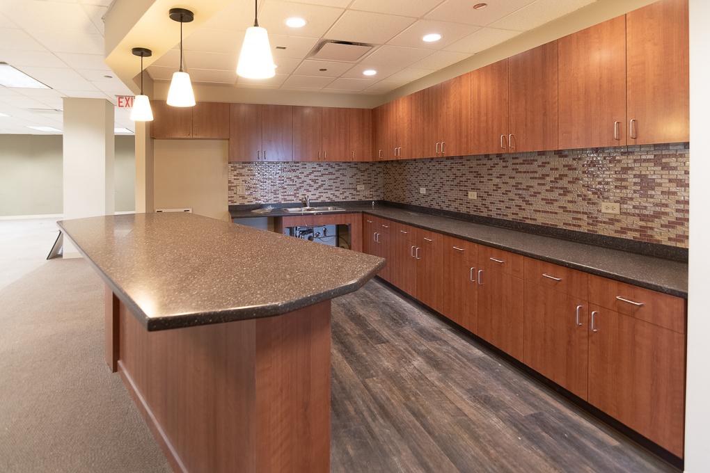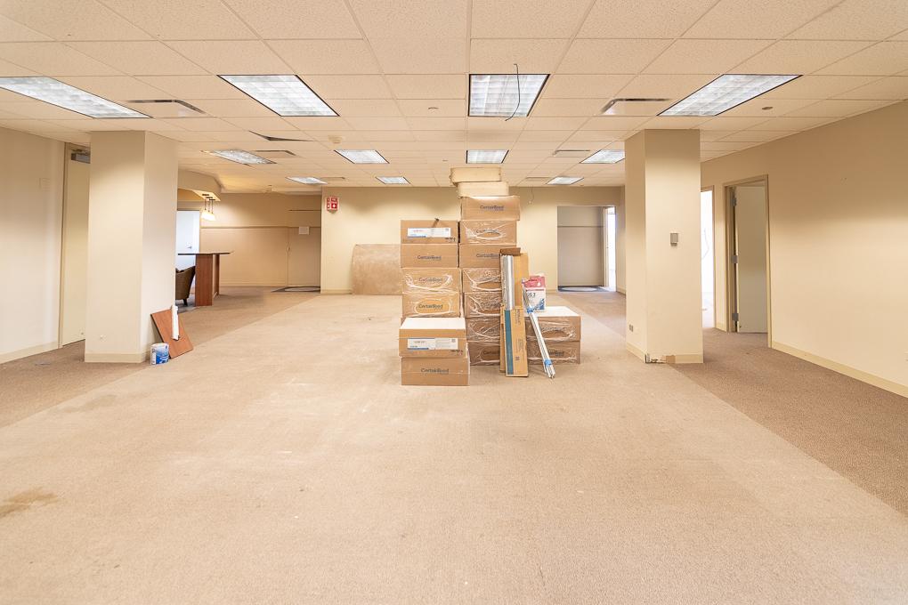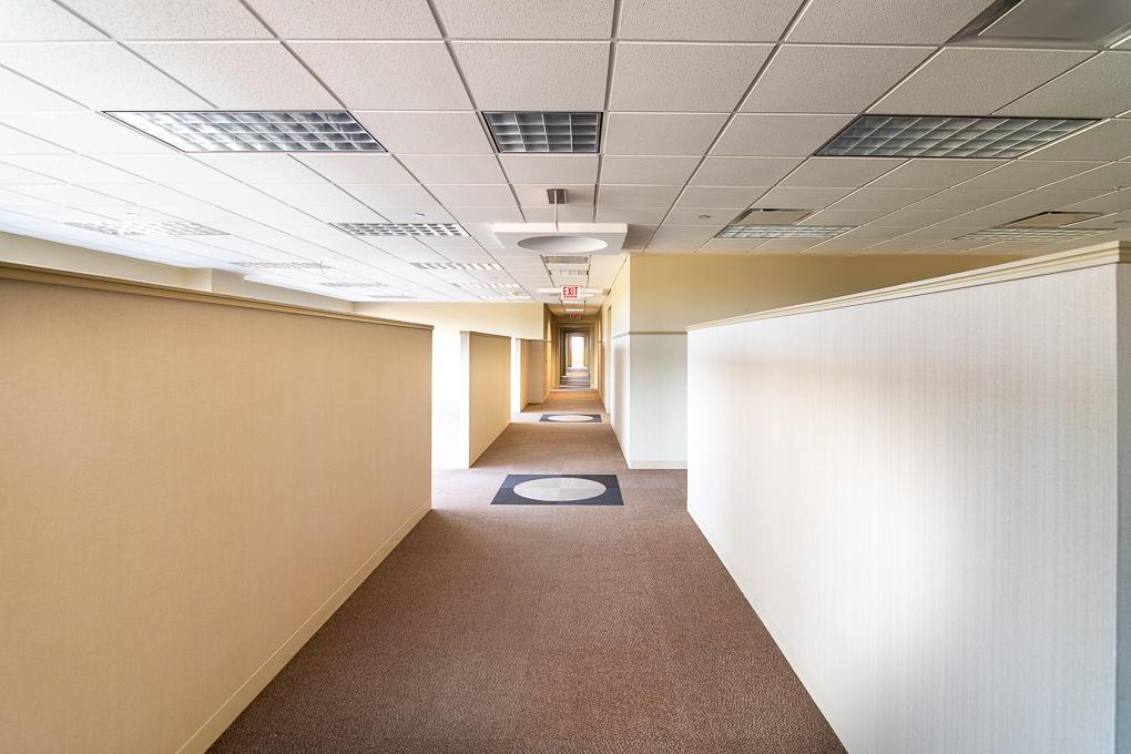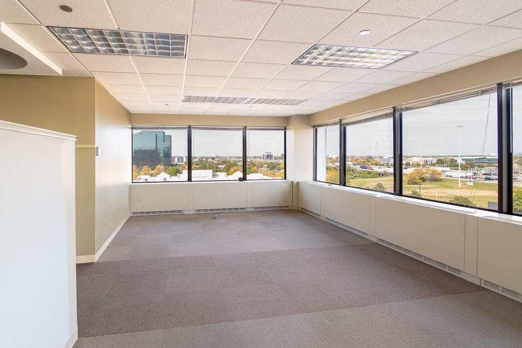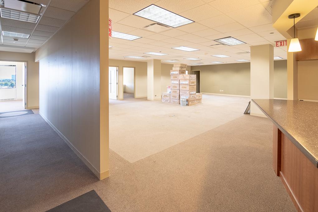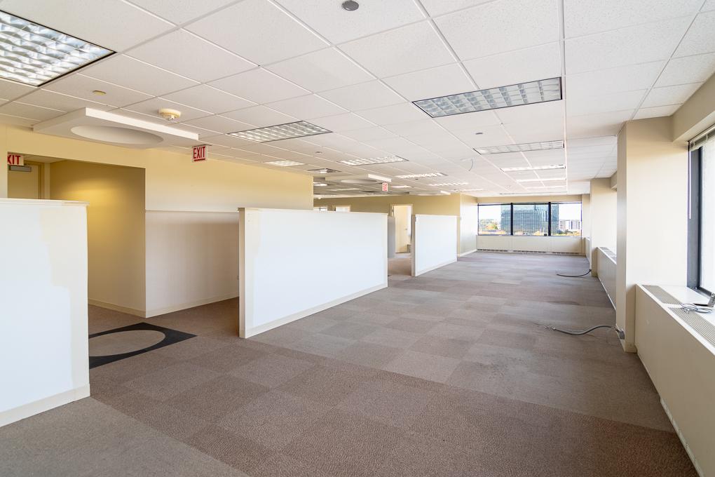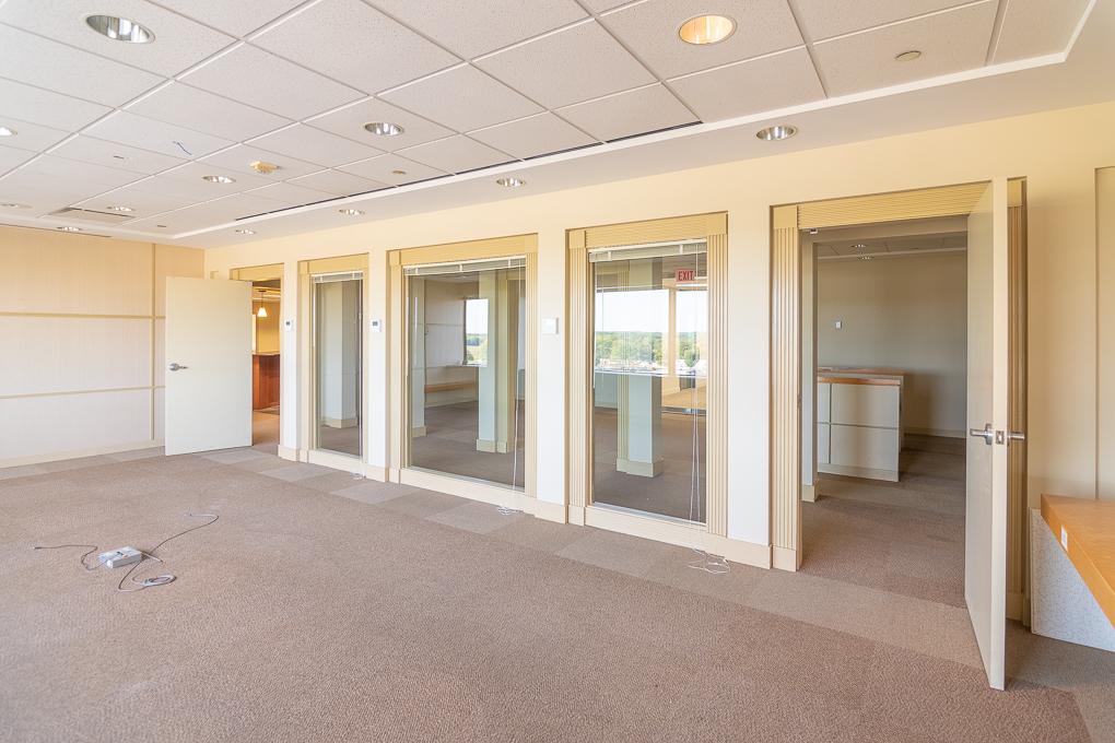Elevator ID. Suite features glass front doors, has seven offices including one office with a private restroom, numerous breakout rooms/non-windowed offices, a kitchen, and an open areas for workstations.