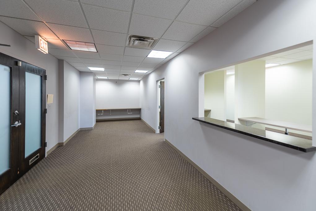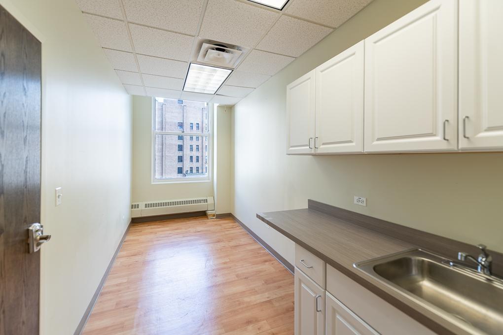 Former Jewelers showroom space with six private offices, in-suite restroom, sink and storage room. Gas and exhaust options available. Fits 6-21 people.