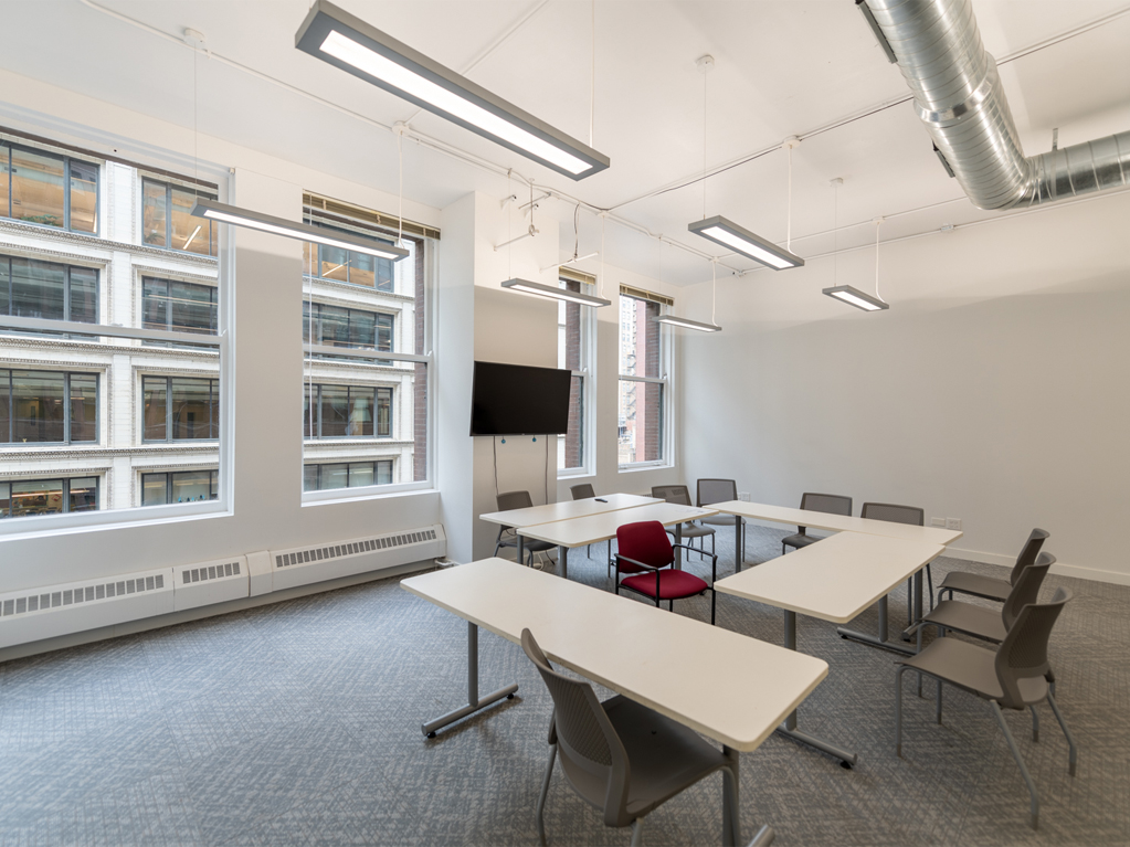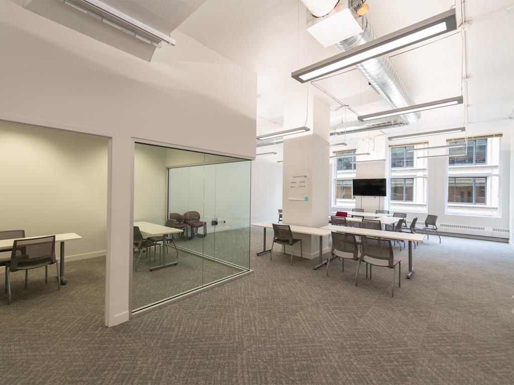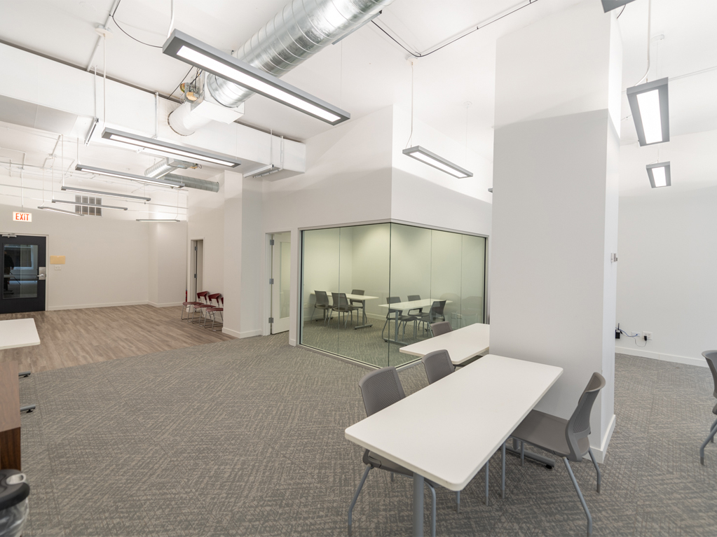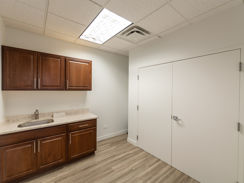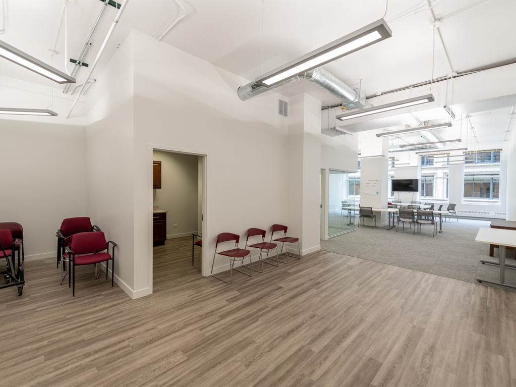 Completed Spec Space. Elevator ID. Features one private office, large open work space and kitchen with upgraded finishes. Fits 4-14 people.